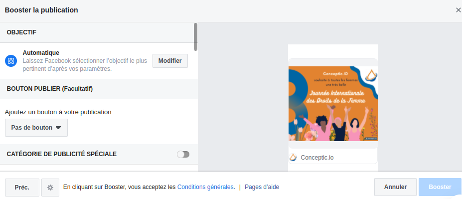 - Enfin, il ne vous reste plus qu’à cliquer sur le bouton bleu « Booster » en bas à droite pour booster votre publication Facebook.