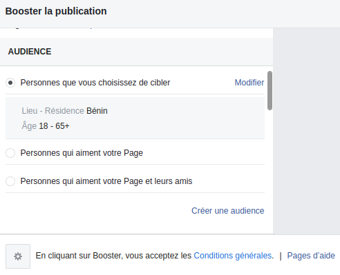 Même si la fonction « booster la publication » est un peu limitée dans les options de ciblage, elle n’en reste pas moins assez complète pour définir une audience.