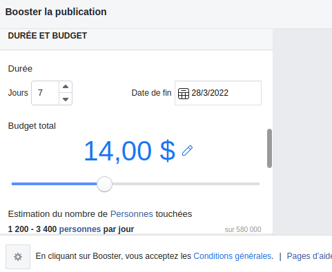 À votre gauche, Facebook vous présente les différentes options pour configurer votre « boost » de publication.