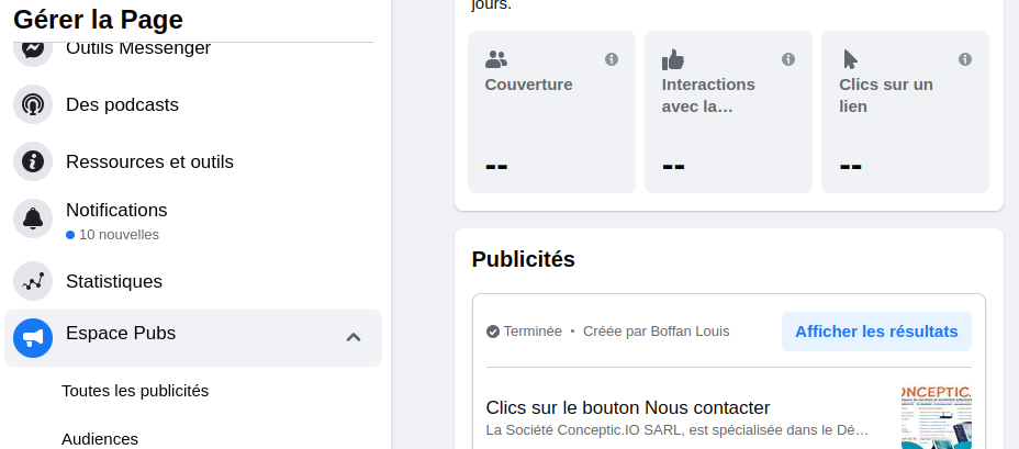 Pour analyser les résultats de votre promotion, rendez-vous simplement dans l’Espace Pubs de votre Page Facebook et choisissez la publicité que vous souhaitez analyser.